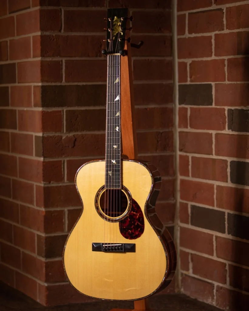 My OM guitars are patterned after the standard Martin OM outline but typically they are a little deeper. It has similar attributes to the west coast model and though it may seem redundant to have this in my lineup, i include it for those people who have a real and understandable affinity for the more traditional look. Scale length is 25.5 inches, with 14 frets to the body.