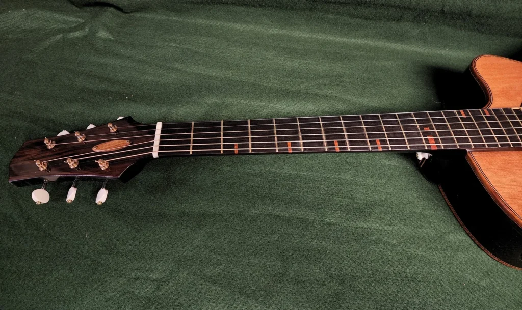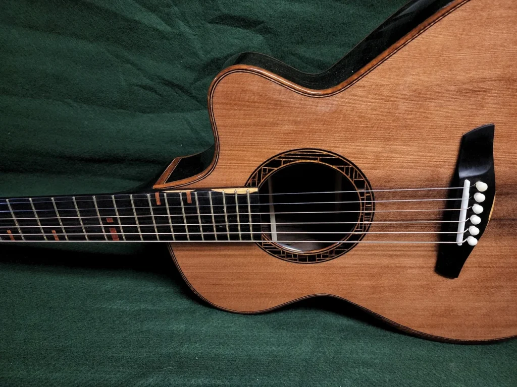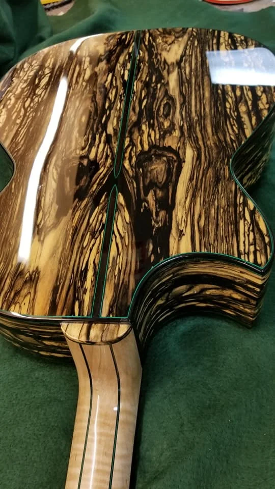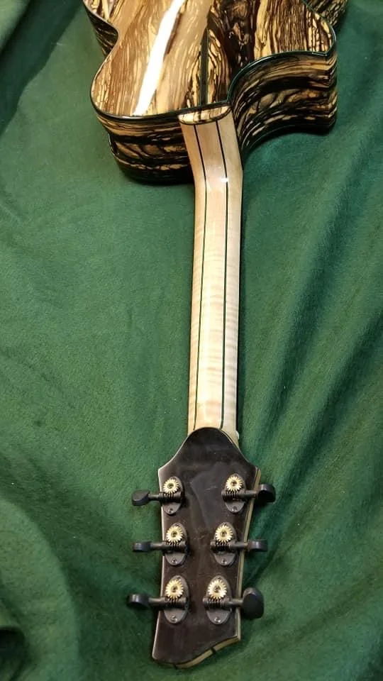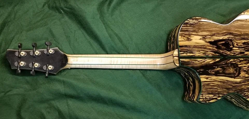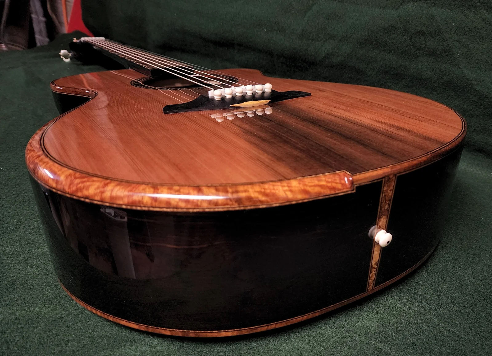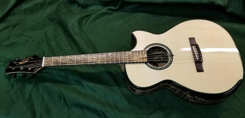 This particular example is made with Black and White Ebony and has an Englemann top. The neck is curly maple.