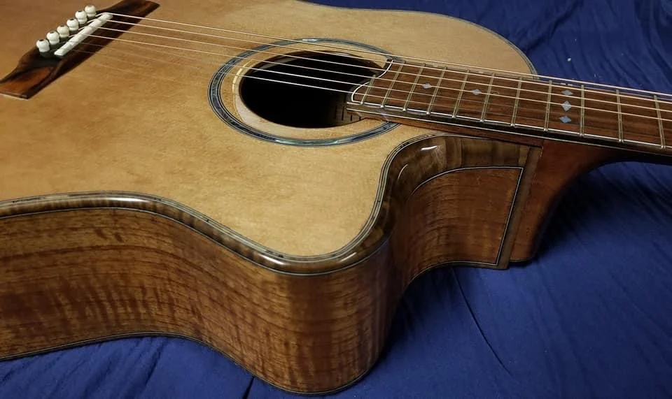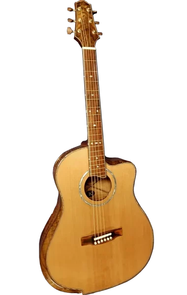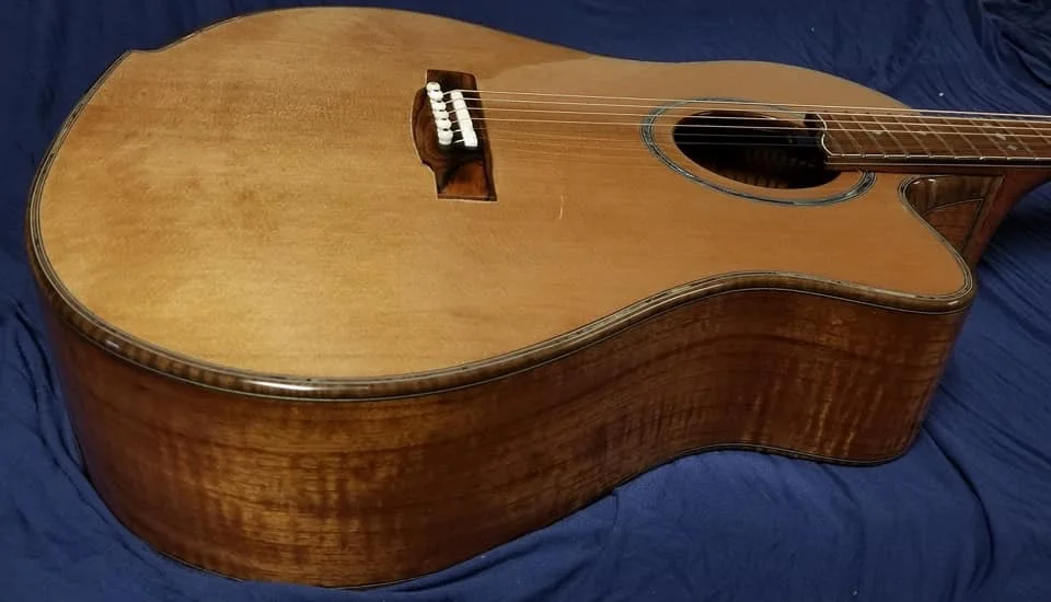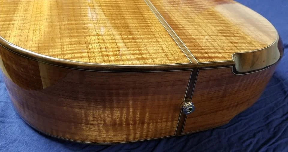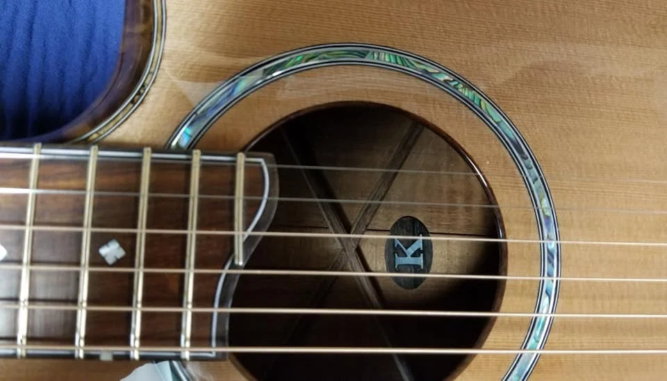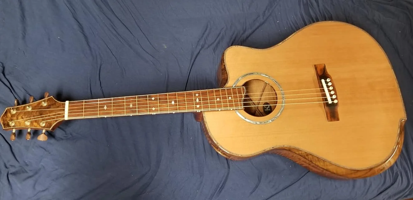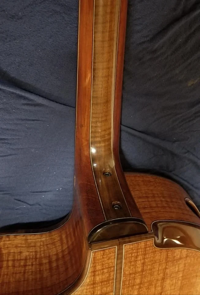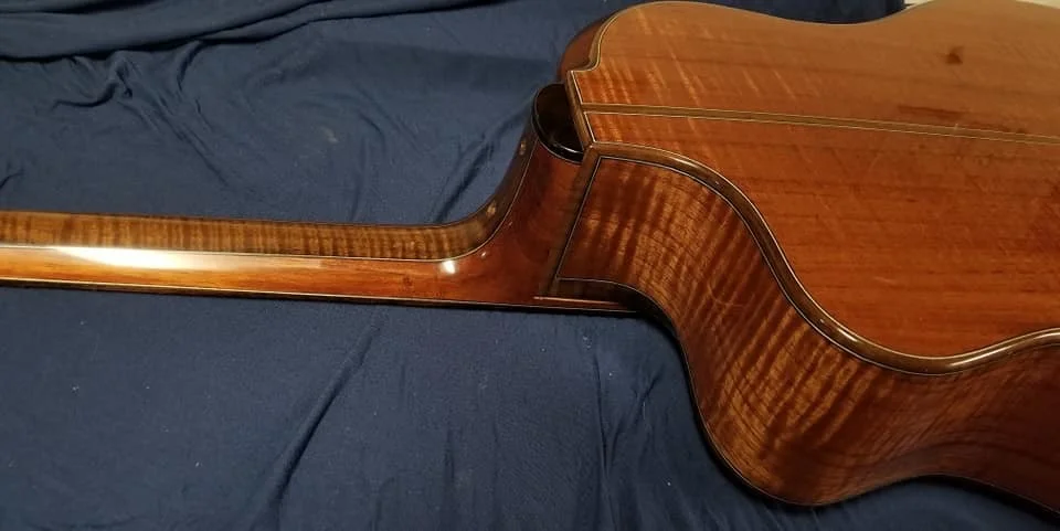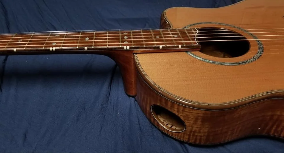 This particular guitar is made of Curly Spanish cedar with Black Walnut trim. It has a cantilevered fingerboard to liberate the upper bout and let it join in the music making. Internally there are carbon fiber struts that carry the string load from the neck block to the waist of the guitar. This particular guitar has an adjustable neck.